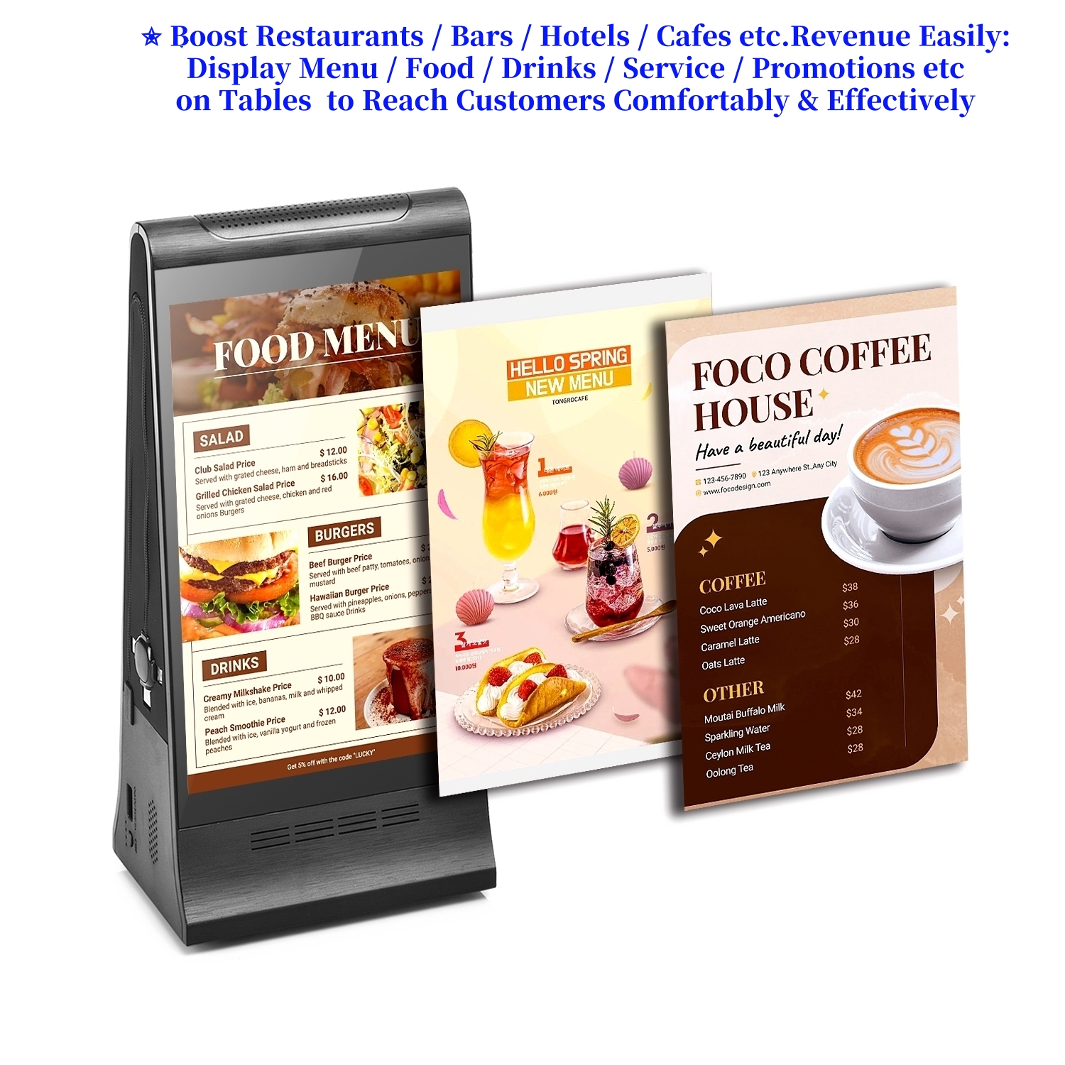 【Ideal for Restaurants, Bars, Coffee Shops, Hotels, Salons Car Dealerships, Banks, VIP Rooms etc】Digital Food / Drinks / Menu / Service Display on Tables to drive immediate purchase intent.